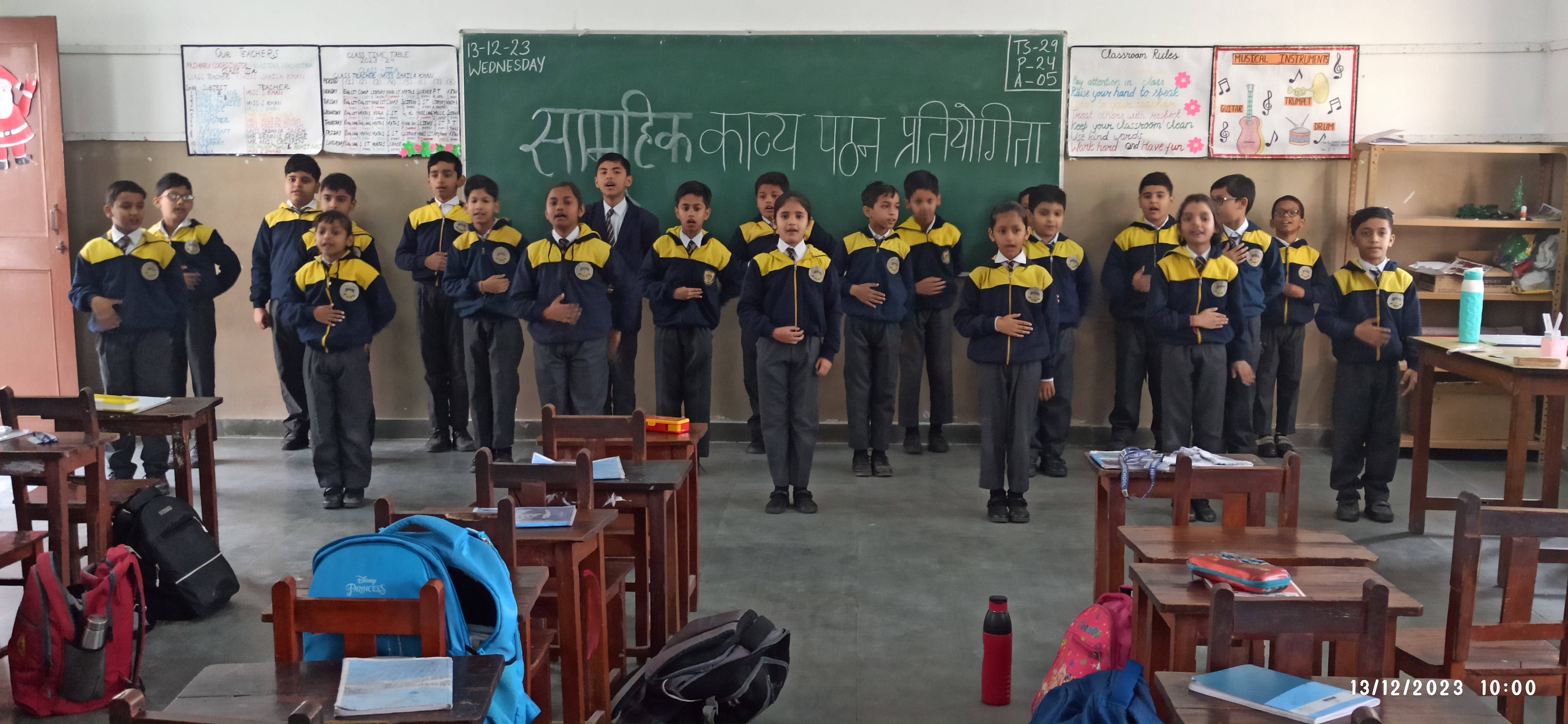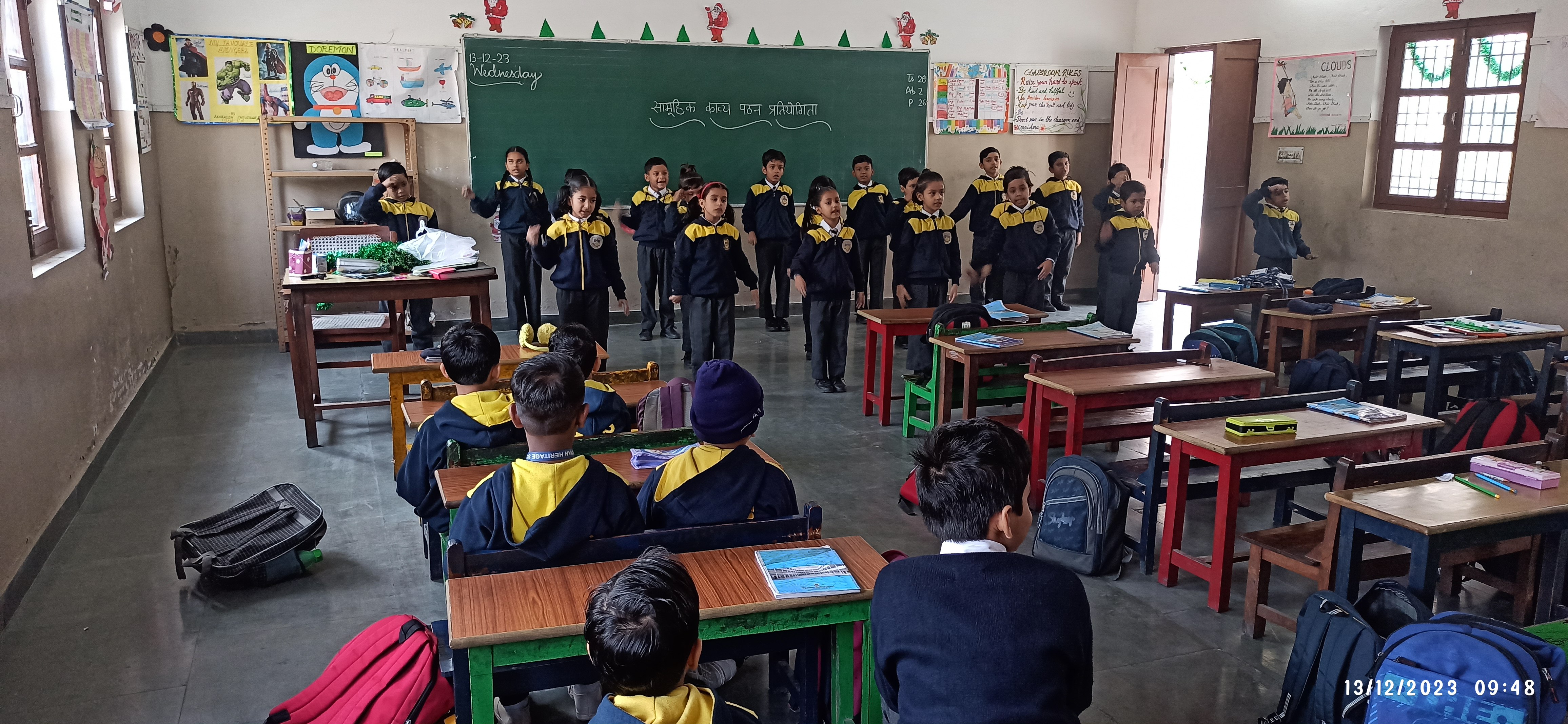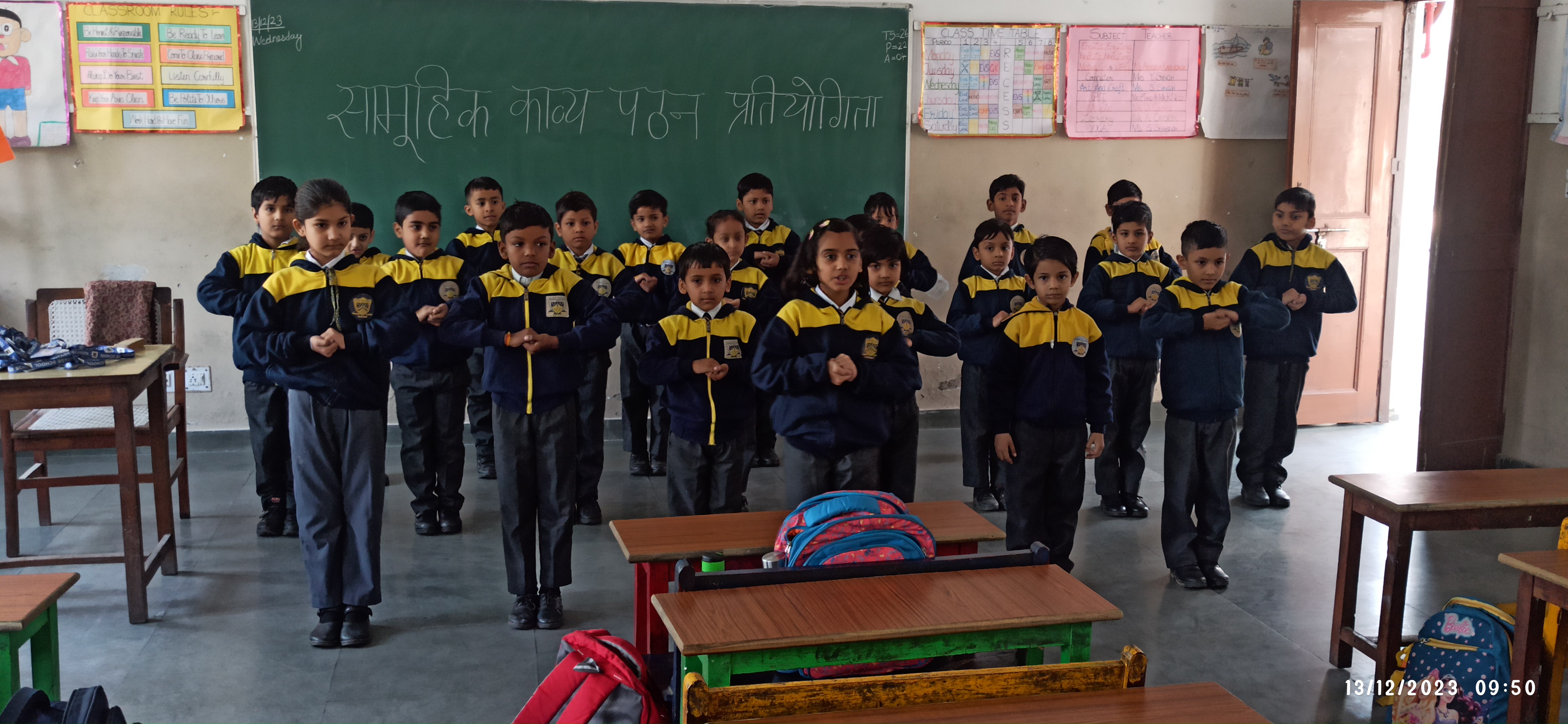 दिनांक 13-12-23 को विद्यालय परिसर में कक्षा एक से पांच तक के बच्चों के लिए सामूहिक काव्य पठन प्रतियोगिता का आयोजन कराया गया। काव्य पाठ करना बच्चों के लिए एक महत्वपूर्ण गतिविधि है। क्योंकि इसमें उनके बोलने के कौशल का विकास होता है और आत्मविश्वास बढ़ता है।