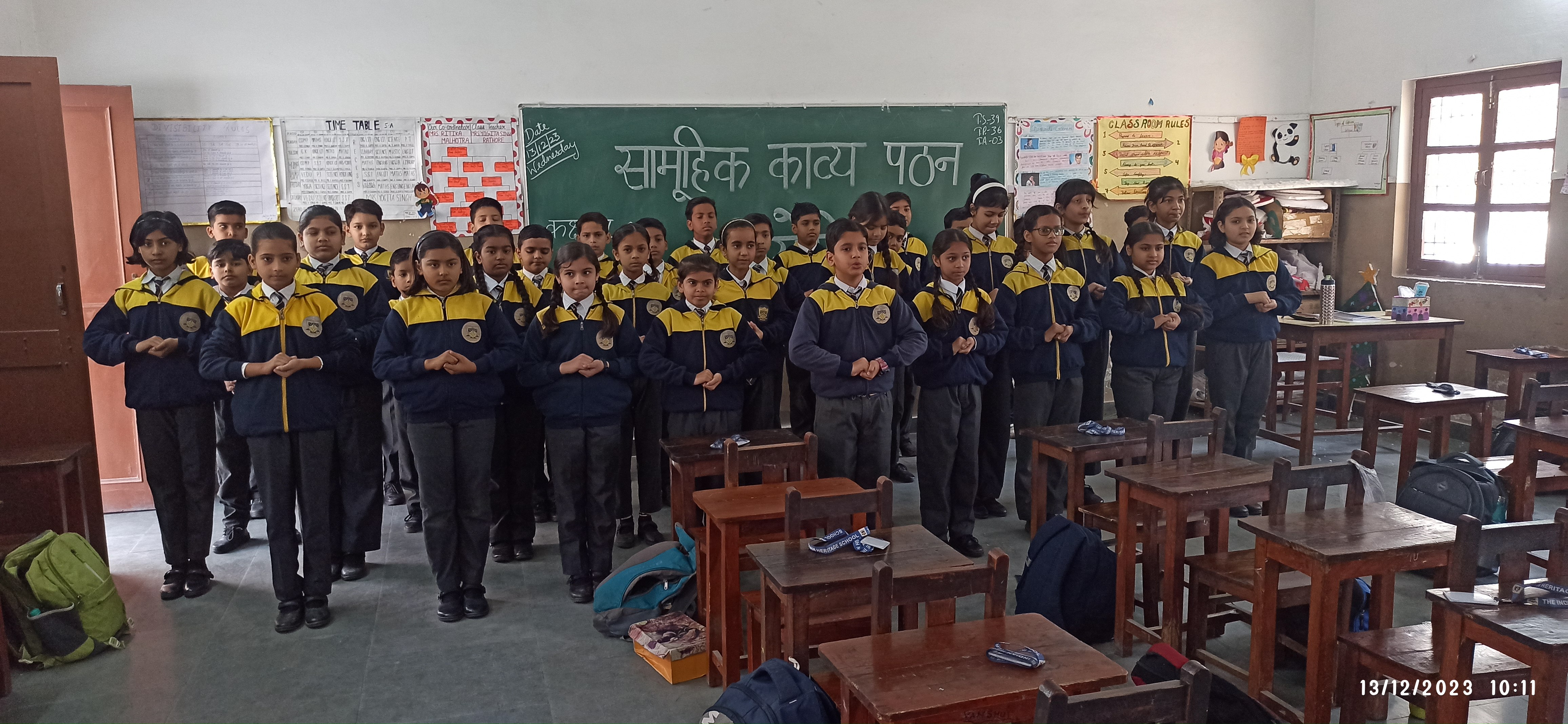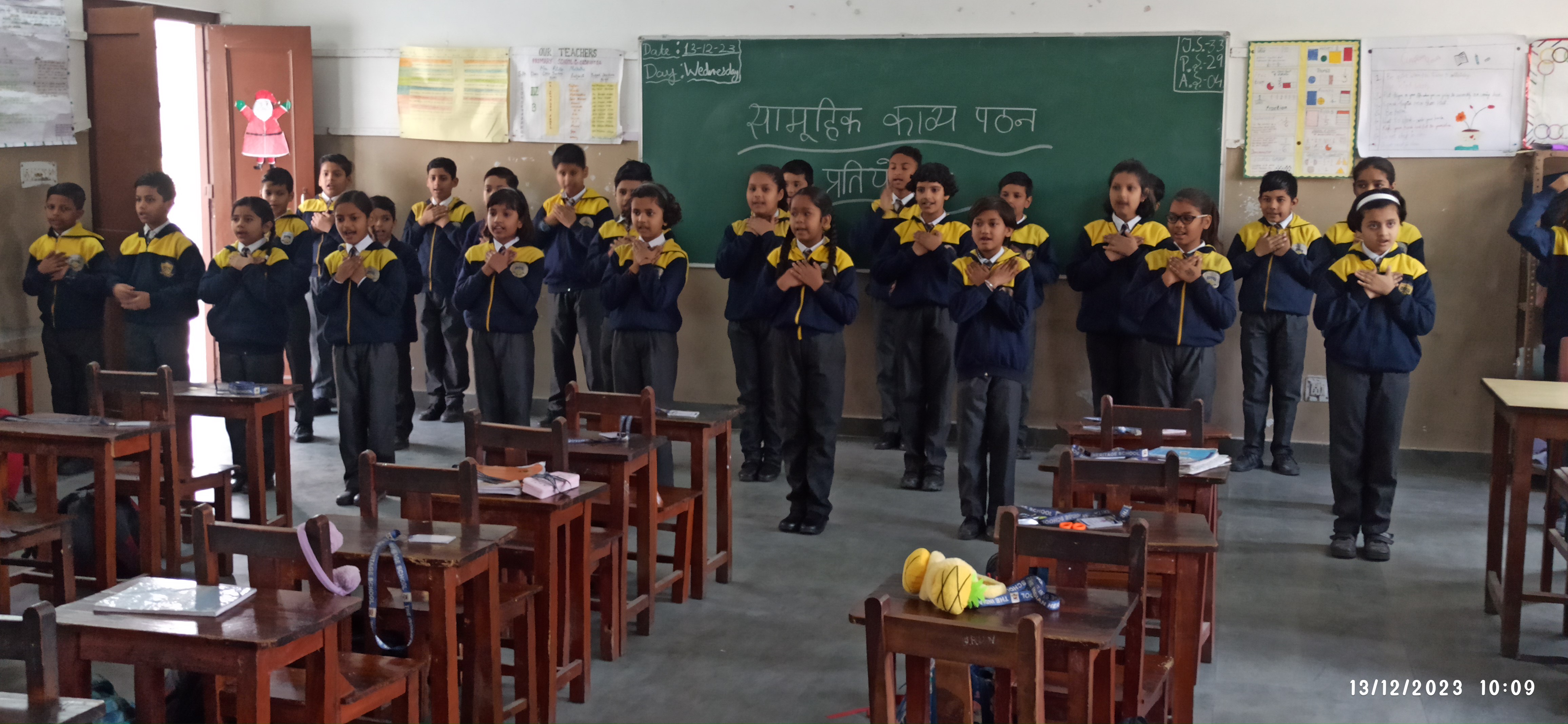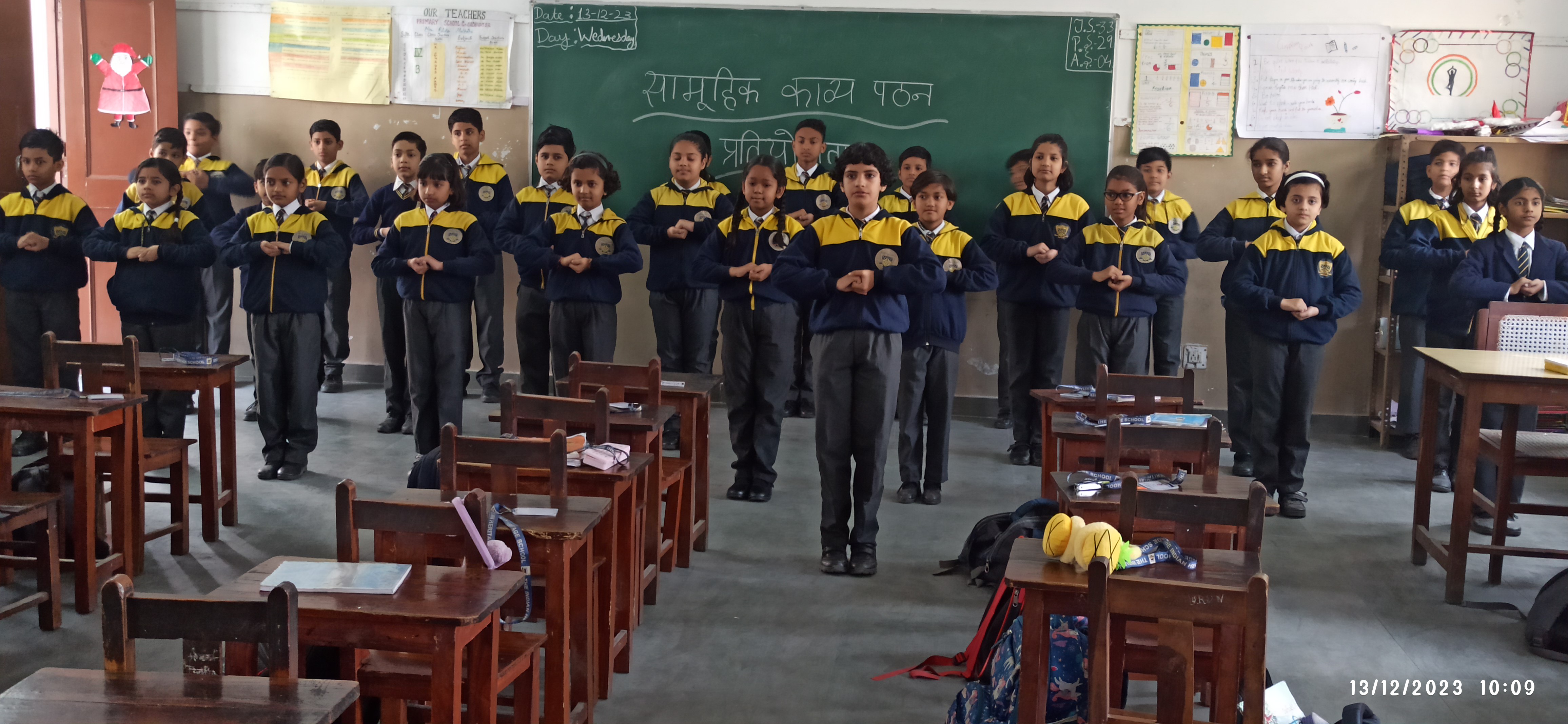 दिनांक 13-12-23 को विद्यालय परिसर में कक्षा एक से पांच तक के बच्चों के लिए सामूहिक काव्य पठन प्रतियोगिता का आयोजन कराया गया। काव्य पाठ करना बच्चों के लिए एक महत्वपूर्ण गतिविधि है। क्योंकि इसमें उनके बोलने के कौशल का विकास होता है और आत्मविश्वास बढ़ता है।